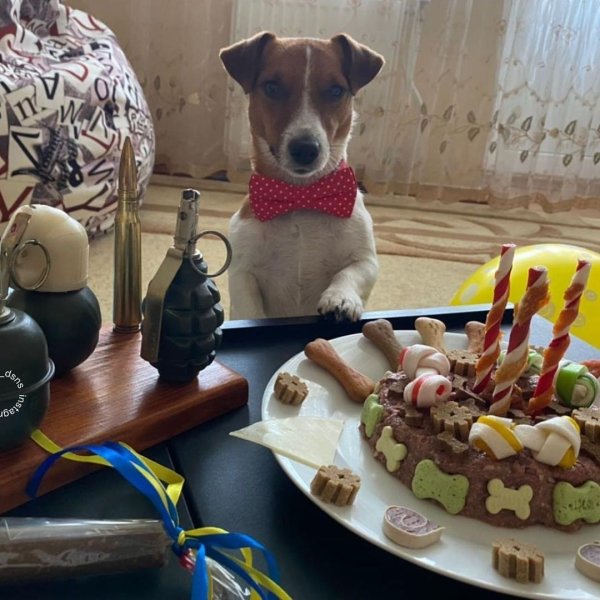 Хозяева Патрона поздравили его тортом из собачьей еды и поделились праздничным фото.