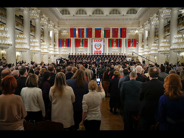 Члены и сторонники Компартии слушают гимн СССР, собравшись в Колонном зале Дома Союзов на праздновании 100-летия образования Советского Союза. Москва, 2022г.