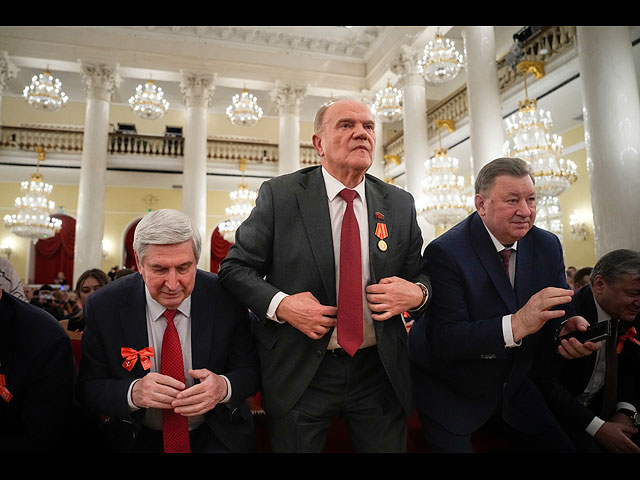 Геннадий Зюганов и члены Компартии слушают гимн СССР, собравшись в Колонном зале Дома Союзов на праздновании 100-летия образования Советского Союза, 2022 год